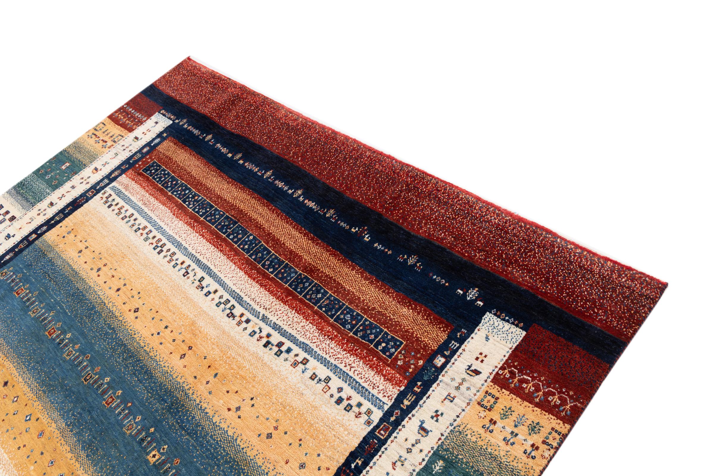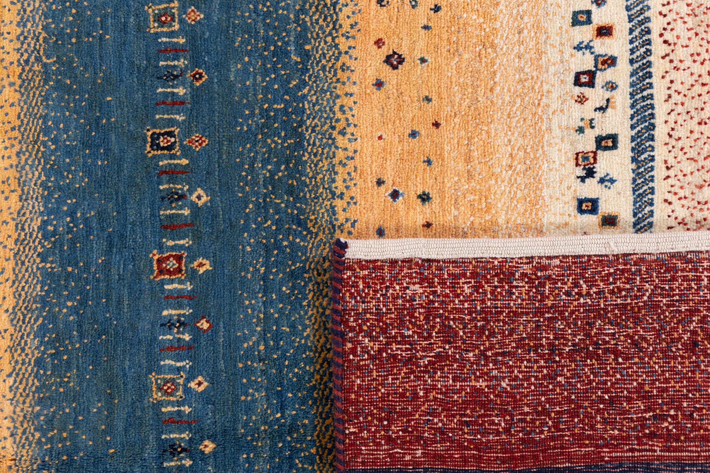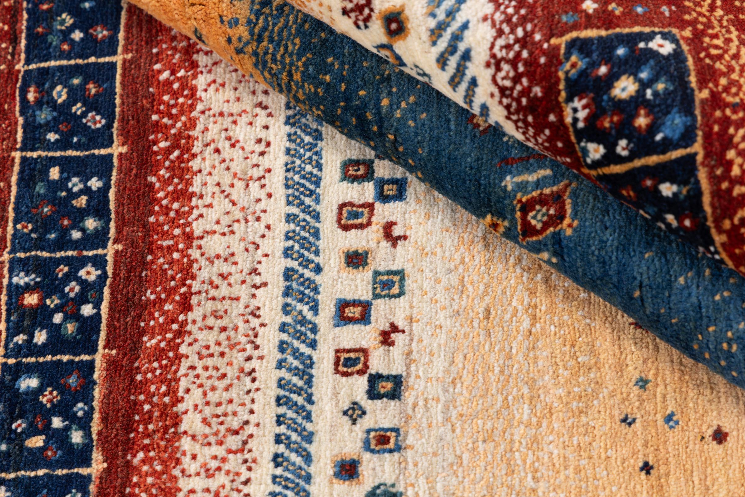 Αυτό το όμορφο χαλί είναι περσικό χαλί Gabbeh και είναι ένα από τα ποιοτικότερα χαλιά Gabbeh. Τα χαλιά δένονται από νομάδες ή ημινομάδες στο Ιράν σύμφωνα με την παραδοσιακή χειροτεχνία. Τα απλά μοτίβα και τα σχέδια είναι κυρίως εμπνευσμένα από το άμεσο περιβάλλον των νομάδων. Για παράδειγμα, καμήλες, δέντρα ή θάμνοι μπορούν να βρεθούν στα παραδοσιακά χαλιά. Τα περσικά χαλιά Gabbeh κατασκευάζονται από μαλλί από κοπάδια προβάτων που εκτρέφονται τοπικά. Ως εκ τούτου, το μαλλί ως επί το πλείστον εξακολουθεί να κλώνεται με το χέρι. Κάθε ένα από αυτά τα ανατολίτικα χαλιά ενσαρκώνει έναν μοναδικό χαρακτήρα αιώνων πολιτισμού.