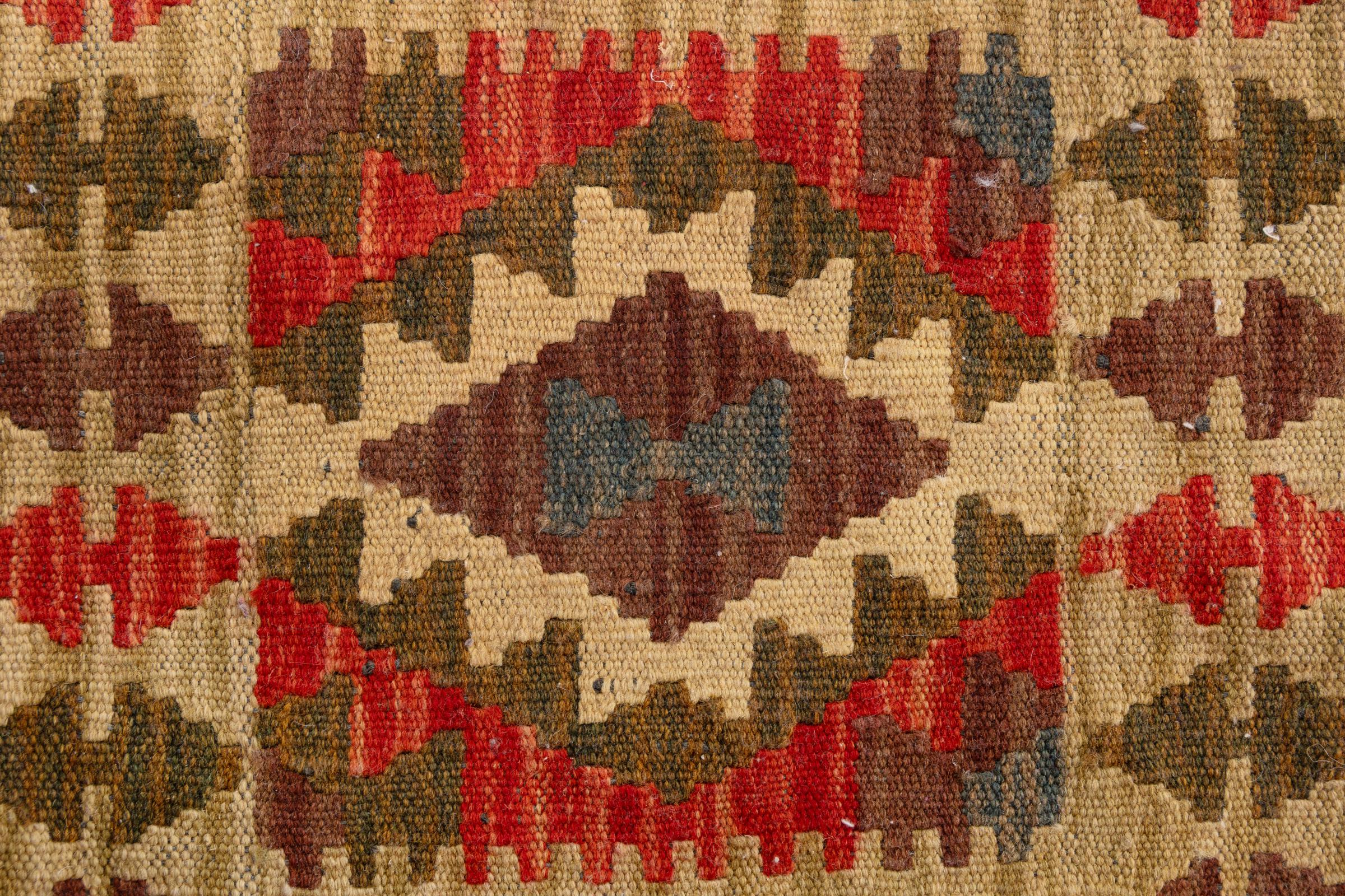 Αυτό το χαλί είναι χειροποίητο ως επίπεδη ύφανση σε αργαλειό. Τα επίπεδα ύφανση είναι χαλιά που δεν έχουν πέλος. Όπως υπόσχεται το όνομα, αυτά τα χαλιά είναι υφαντά και όχι δεμένα με κόμπους. Αυτό έχει ως αποτέλεσμα ένα επίπεδο χαλί με ανάγλυφη επιφάνεια. Τα flatweaves δεν είναι τόσο μαλακά και συνήθως πιο λεπτά από τα χαλιά με κόμπους. Ταυτόχρονα, είναι πολύ λιγότερο πολύπλοκα στην κατασκευή τους και μπορούν συνήθως να τοποθετηθούν και από τις δύο πλευρές (εμπρός και πίσω). Τα σχέδια τους είναι συνήθως γεωμετρικά, κάτι που οφείλεται στην ύφανση.