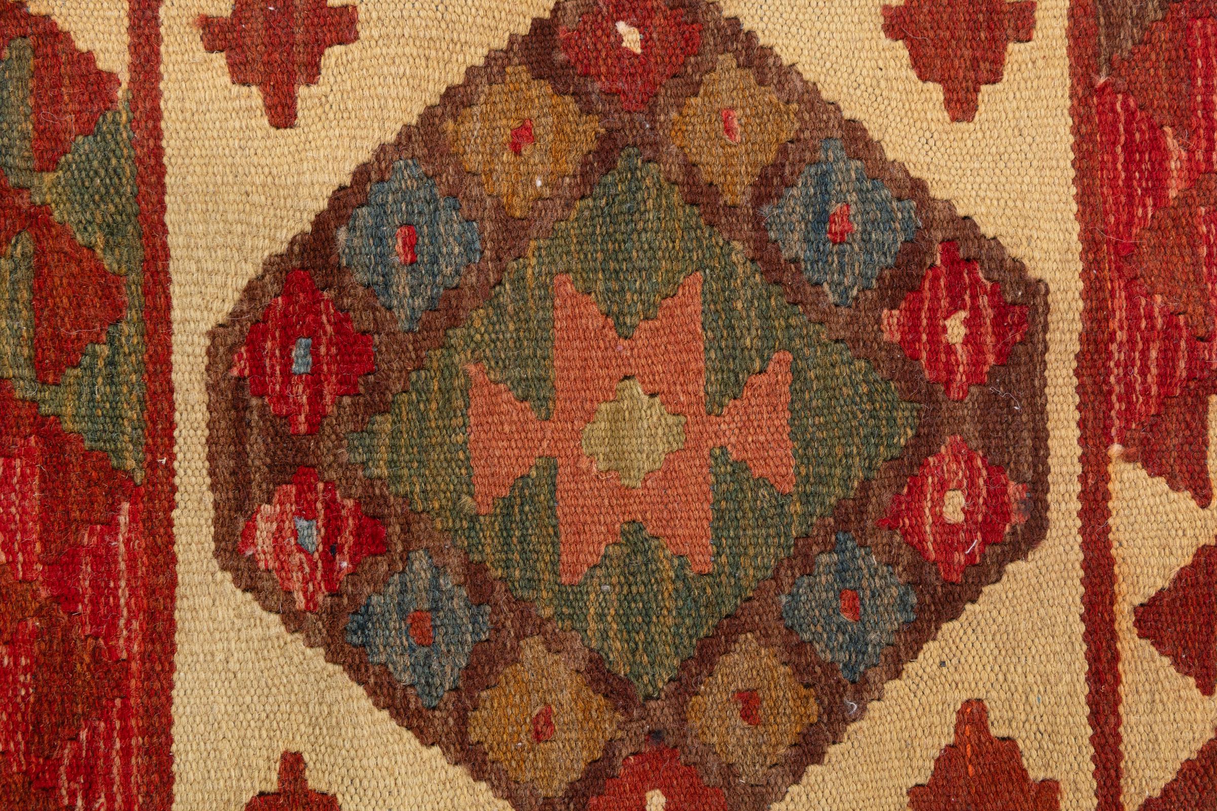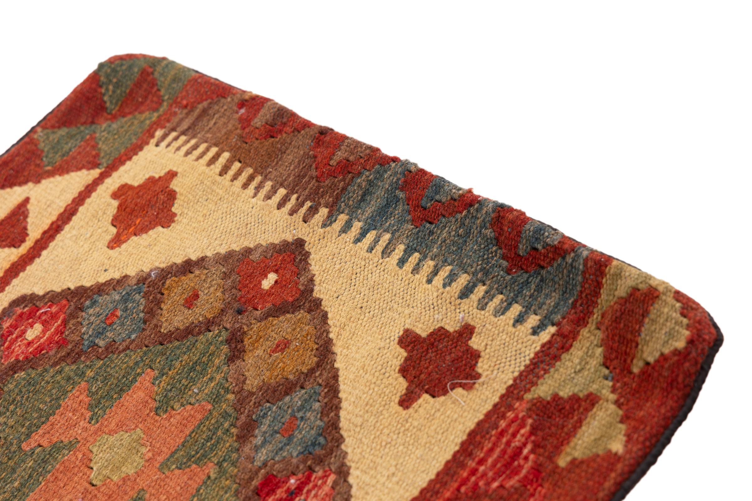 Αυτό το χαλί είναι χειροποίητο ως επίπεδη ύφανση σε αργαλειό. Τα επίπεδα ύφανση είναι χαλιά που δεν έχουν πέλος. Όπως υπόσχεται το όνομα, αυτά τα χαλιά είναι υφαντά και όχι δεμένα με κόμπους. Αυτό έχει ως αποτέλεσμα ένα επίπεδο χαλί με ανάγλυφη επιφάνεια. Τα flatweaves δεν είναι τόσο μαλακά και συνήθως πιο λεπτά από τα χαλιά με κόμπους. Ταυτόχρονα, είναι πολύ λιγότερο πολύπλοκα στην κατασκευή τους και μπορούν συνήθως να τοποθετηθούν και από τις δύο πλευρές (εμπρός και πίσω). Τα σχέδια τους είναι συνήθως γεωμετρικά, κάτι που οφείλεται στην ύφανση.