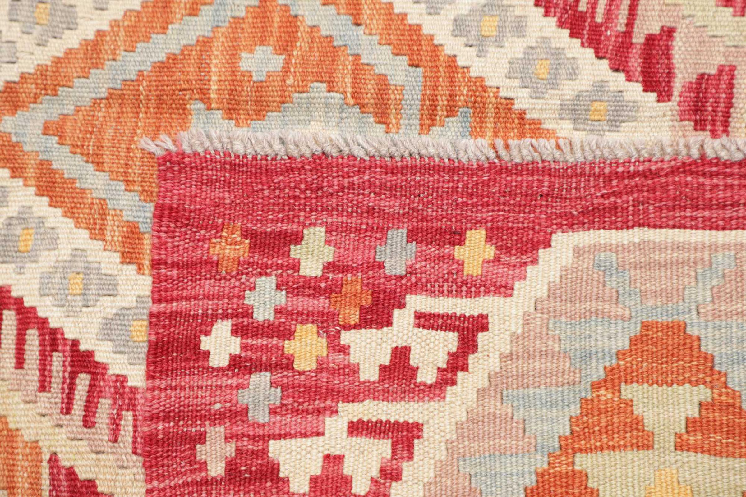 Αυτό το χαλί είναι χειροποίητο ως επίπεδη ύφανση σε αργαλειό. Τα επίπεδα ύφανση είναι χαλιά που δεν έχουν πέλος. Όπως υπόσχεται το όνομα, αυτά τα χαλιά είναι υφαντά και όχι δεμένα με κόμπους. Αυτό έχει ως αποτέλεσμα ένα επίπεδο χαλί με ανάγλυφη επιφάνεια. Τα flatweaves δεν είναι τόσο μαλακά και συνήθως πιο λεπτά από τα χαλιά με κόμπους. Ταυτόχρονα, είναι πολύ λιγότερο πολύπλοκα στην κατασκευή τους και μπορούν συνήθως να τοποθετηθούν και από τις δύο πλευρές (εμπρός και πίσω). Τα σχέδια τους είναι συνήθως γεωμετρικά, κάτι που οφείλεται στην ύφανση.