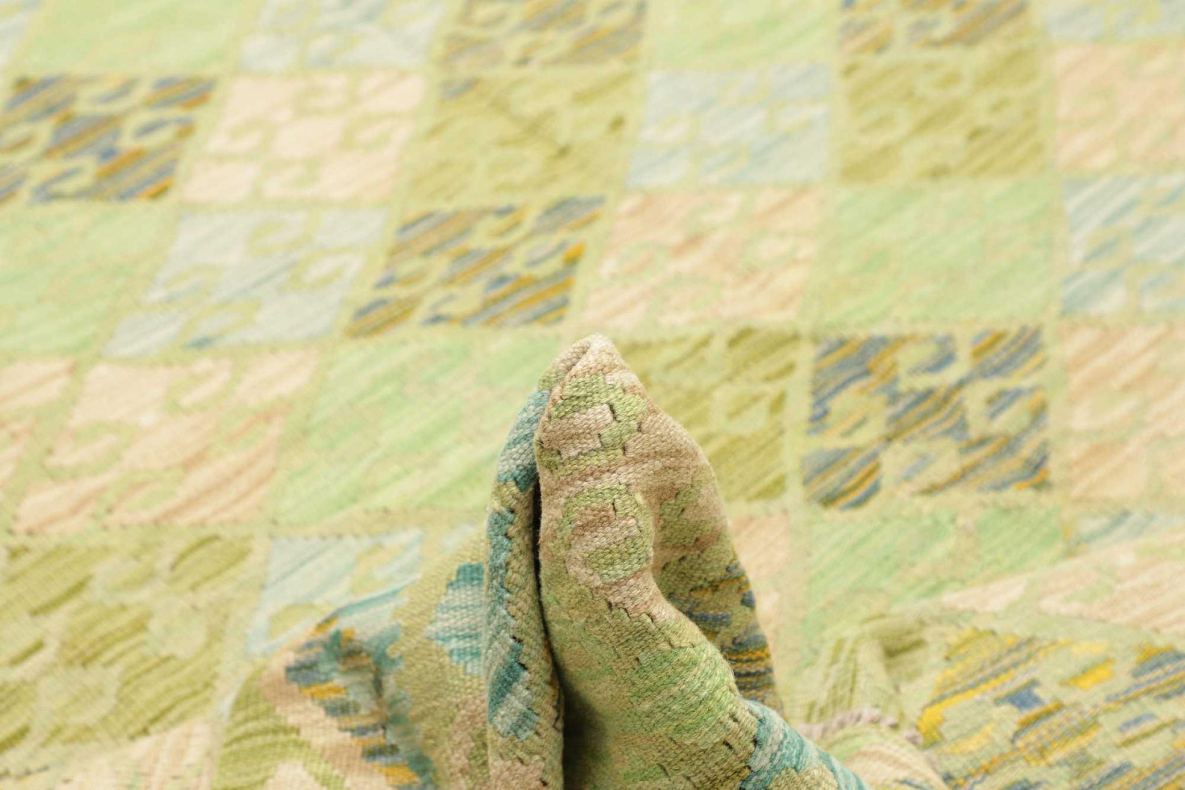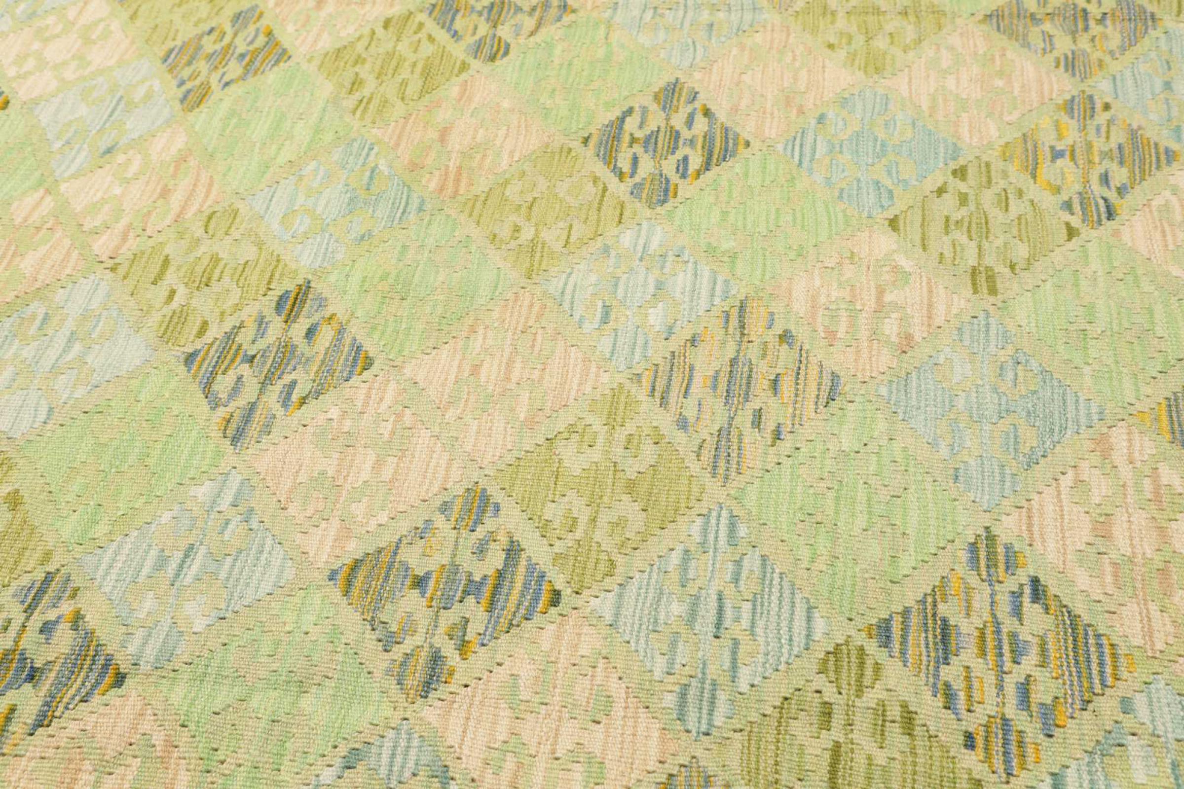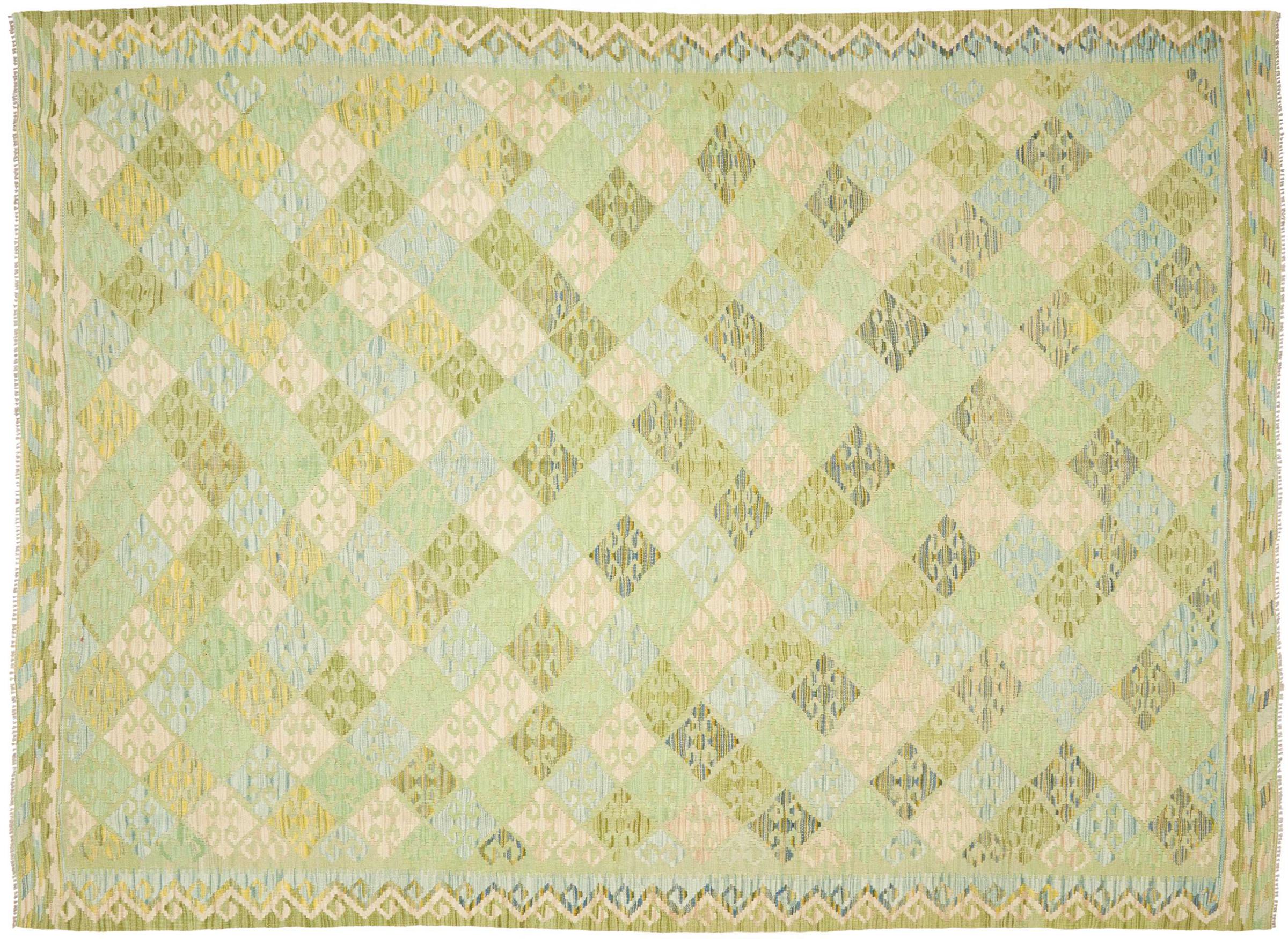 Αυτό το χαλί είναι χειροποίητο ως επίπεδη ύφανση σε αργαλειό. Τα επίπεδα ύφανση είναι χαλιά που δεν έχουν πέλος. Όπως υπόσχεται το όνομα, αυτά τα χαλιά είναι υφαντά και όχι δεμένα με κόμπους. Αυτό έχει ως αποτέλεσμα ένα επίπεδο χαλί με ανάγλυφη επιφάνεια. Τα flatweaves δεν είναι τόσο μαλακά και συνήθως πιο λεπτά από τα χαλιά με κόμπους. Ταυτόχρονα, είναι πολύ λιγότερο πολύπλοκα στην κατασκευή τους και μπορούν συνήθως να τοποθετηθούν και από τις δύο πλευρές (εμπρός και πίσω). Τα σχέδια τους είναι συνήθως γεωμετρικά, κάτι που οφείλεται στην ύφανση.