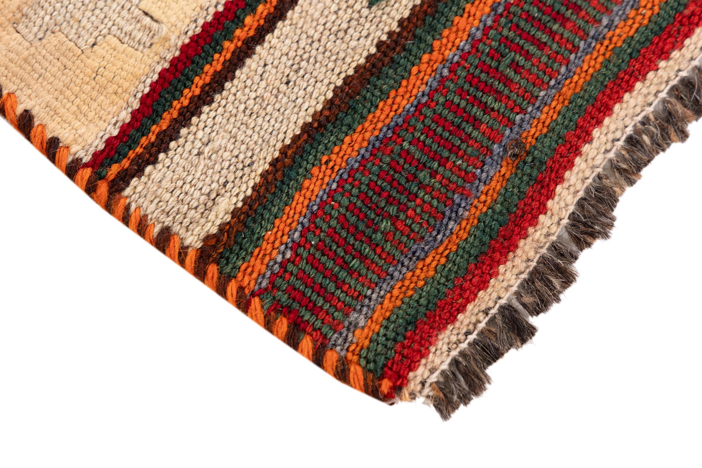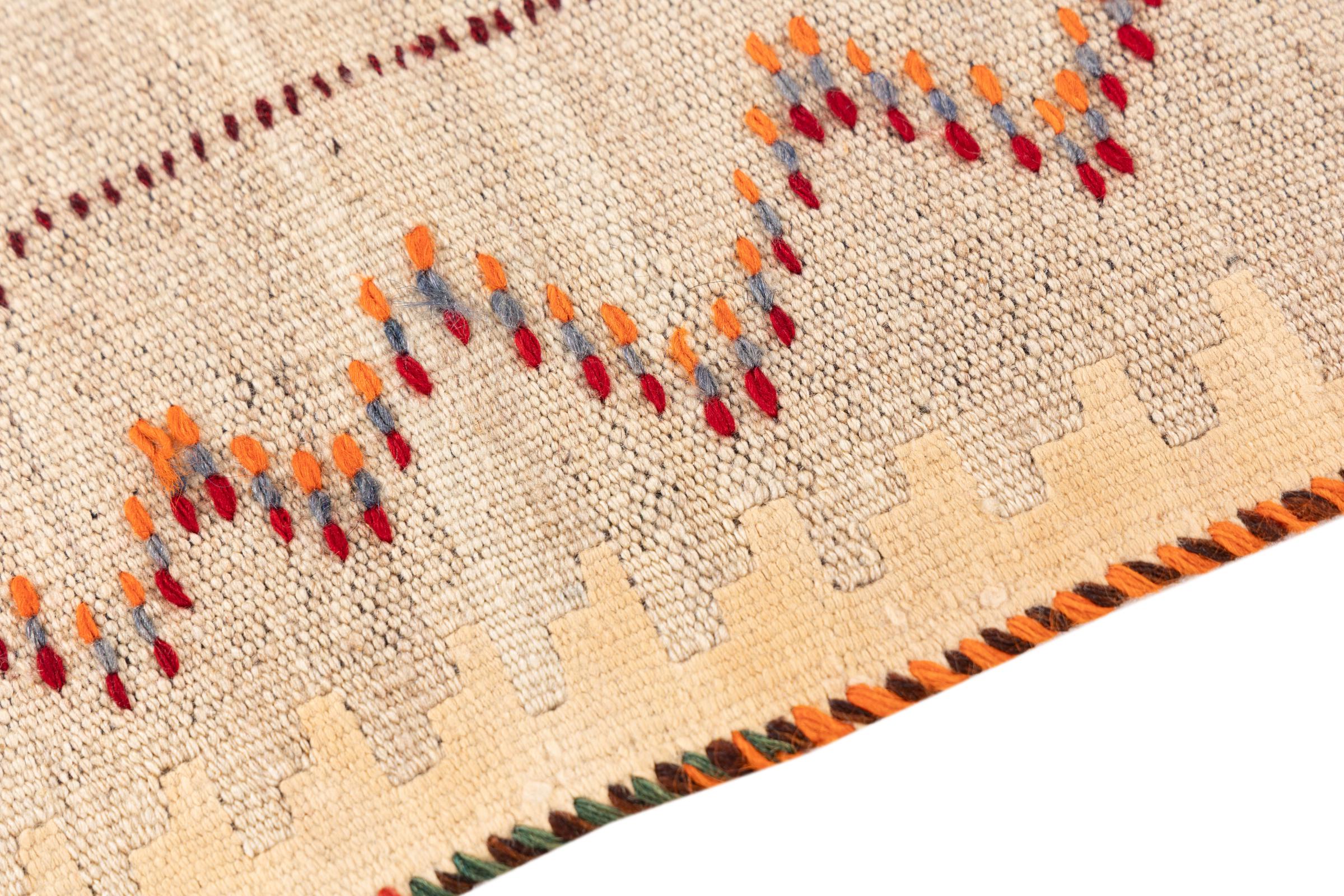 Αυτό το χαλί είναι χειροποίητο ως επίπεδη ύφανση σε αργαλειό. Τα επίπεδα ύφανση είναι χαλιά που δεν έχουν πέλος. Όπως υπόσχεται το όνομα, αυτά τα χαλιά είναι υφαντά και όχι δεμένα με κόμπους. Αυτό έχει ως αποτέλεσμα ένα επίπεδο χαλί με ανάγλυφη επιφάνεια. Τα flatweaves δεν είναι τόσο μαλακά και συνήθως πιο λεπτά από τα χαλιά με κόμπους. Ταυτόχρονα, είναι πολύ λιγότερο πολύπλοκα στην κατασκευή τους και μπορούν συνήθως να τοποθετηθούν και από τις δύο πλευρές (εμπρός και πίσω). Τα σχέδια τους είναι συνήθως γεωμετρικά, κάτι που οφείλεται στην ύφανση.