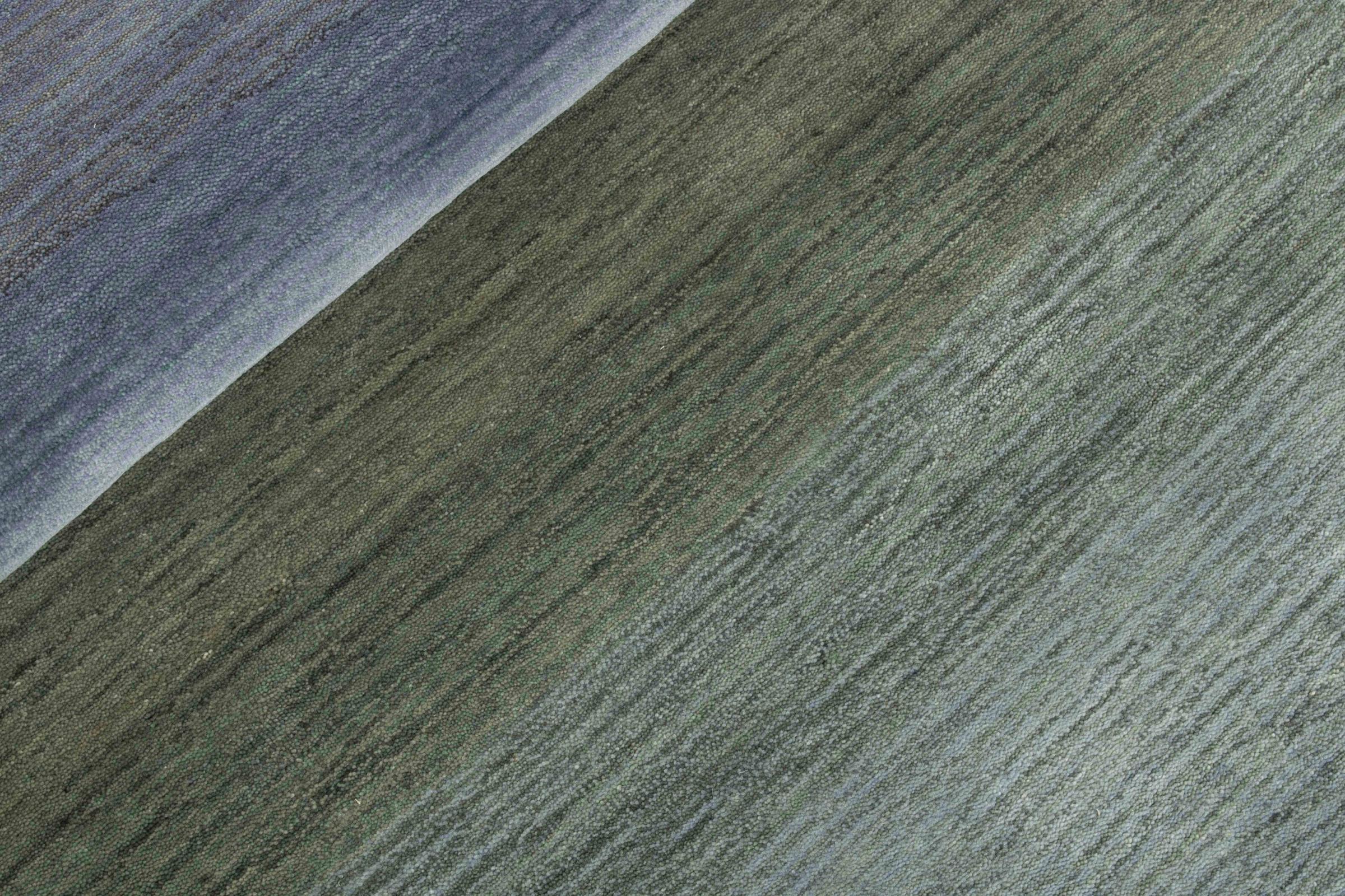 Αυτό το χειροποίητο χαλί σχεδιαστή χρησιμοποιεί σκόπιμα λεπτές διαβαθμίσεις ενός συγκεκριμένου χρωματικού φάσματος. Αυτό δημιουργεί έναν ήρεμο και ταυτόχρονα μοντέρνο σχεδιασμό. Το φυσικό μαλλί έχει χρησιμοποιηθεί μαζί με βισκόζη για να δημιουργήσει μια όμορφη λάμψη. Το χρωματικό φάσμα φαίνεται πραγματικά συναρπαστικό στην πραγματικότητα.