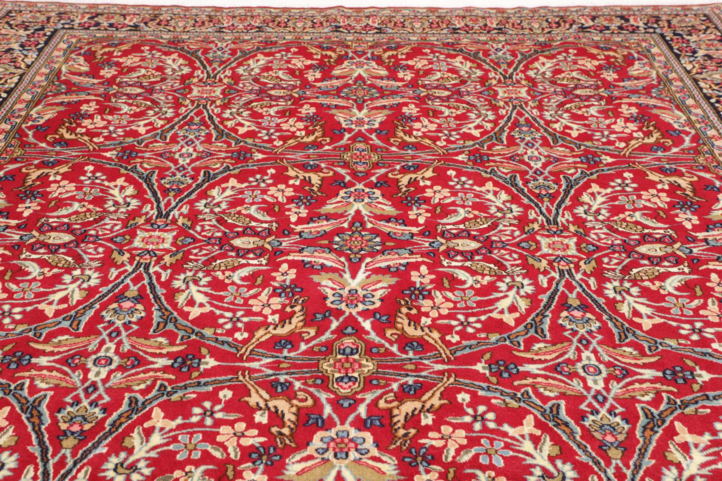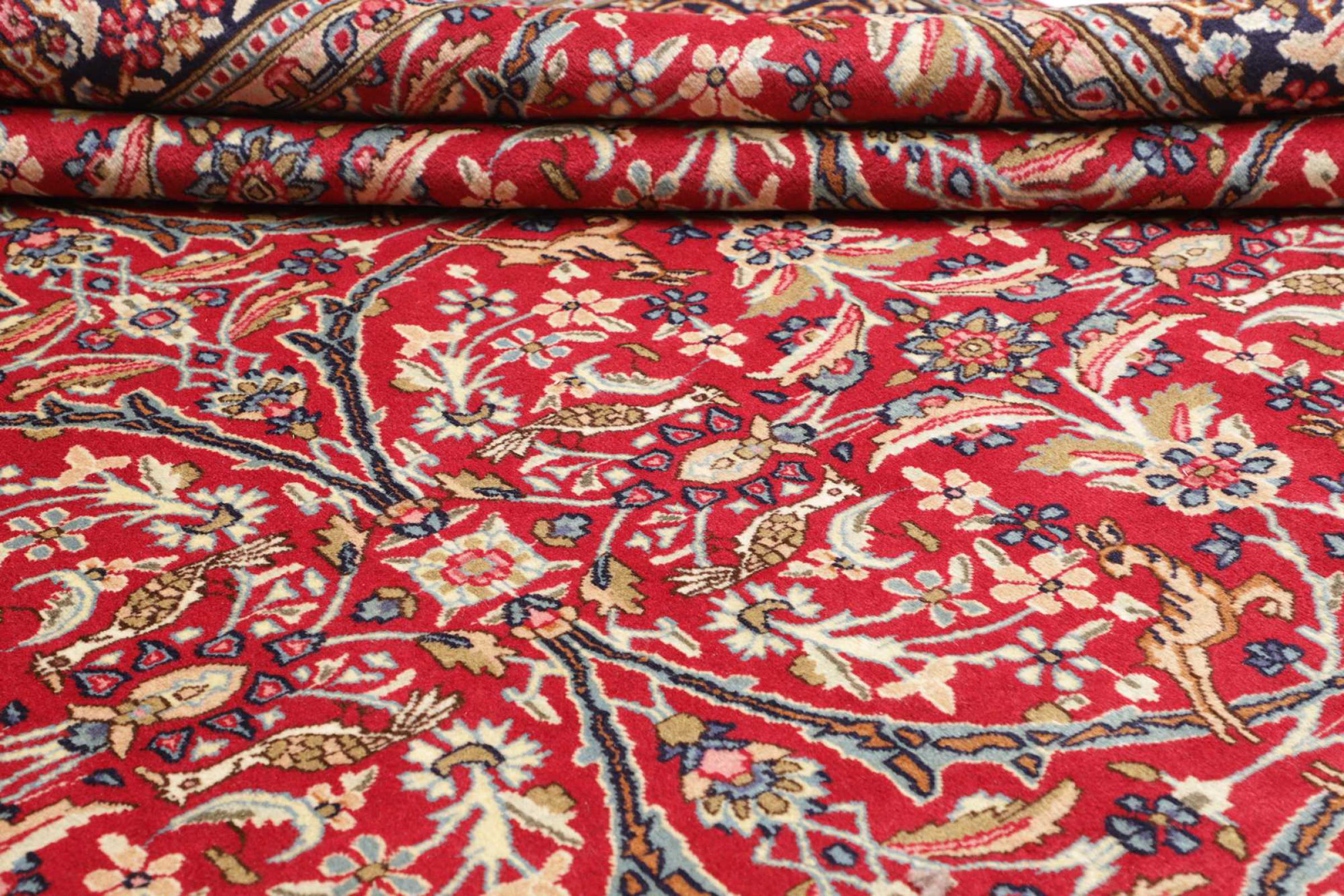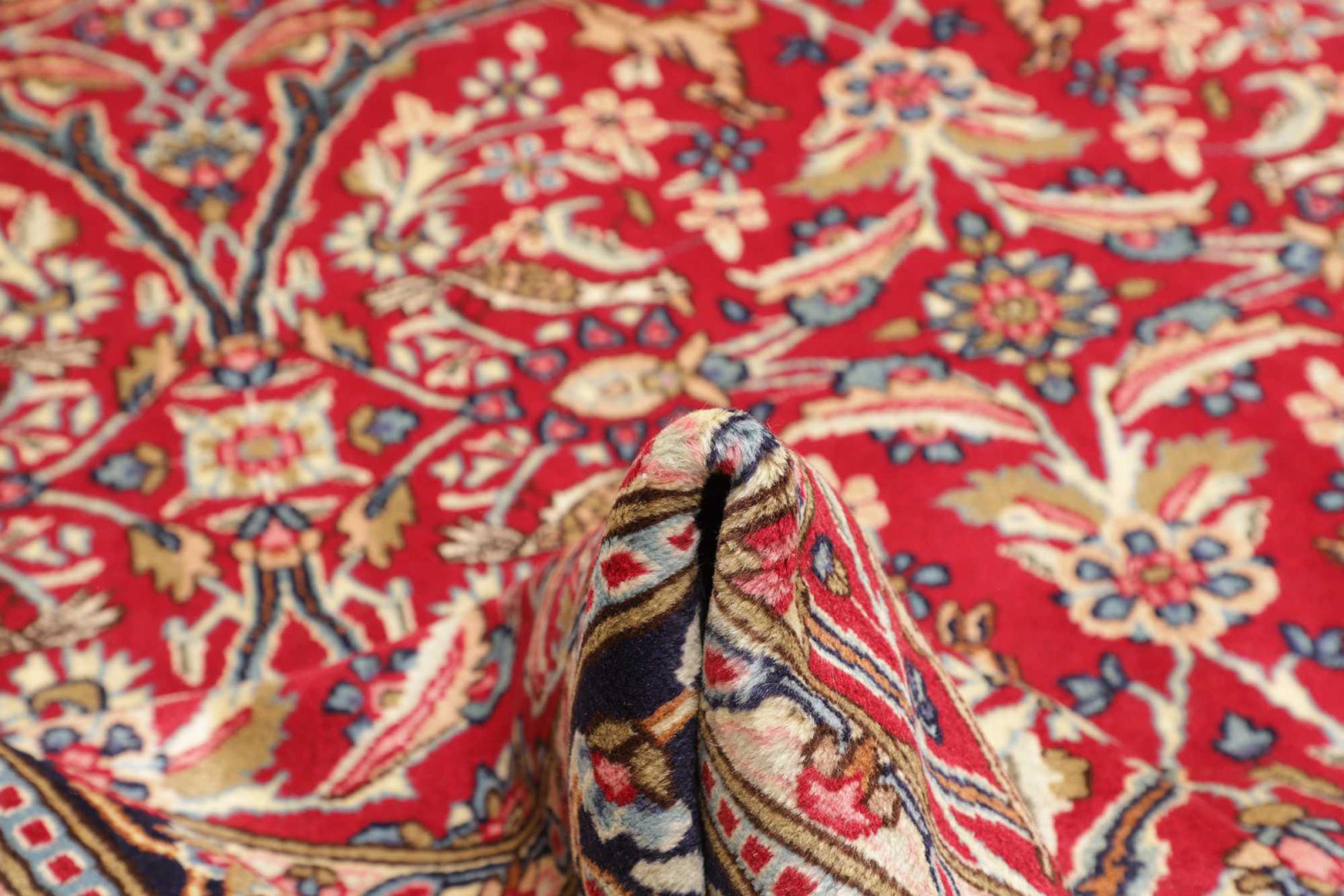 Αυτό το χαλί Kerman εντυπωσιάζει με την ποιότητα και τον σχεδιασμό του. Πλέχτηκε στο χέρι στην πόλη Kerman, μια όαση σε μια έρημο μακριά από την Τεχεράνη, από νήματα υψηλής ποιότητας σε διάστημα μηνών. Δείτε αυτό το έργο τέχνης με τα μάτια σας. Δίνει στο δωμάτιό σας μια όμορφη ανατολίτικη πινελιά με φυτικά στολίδια.