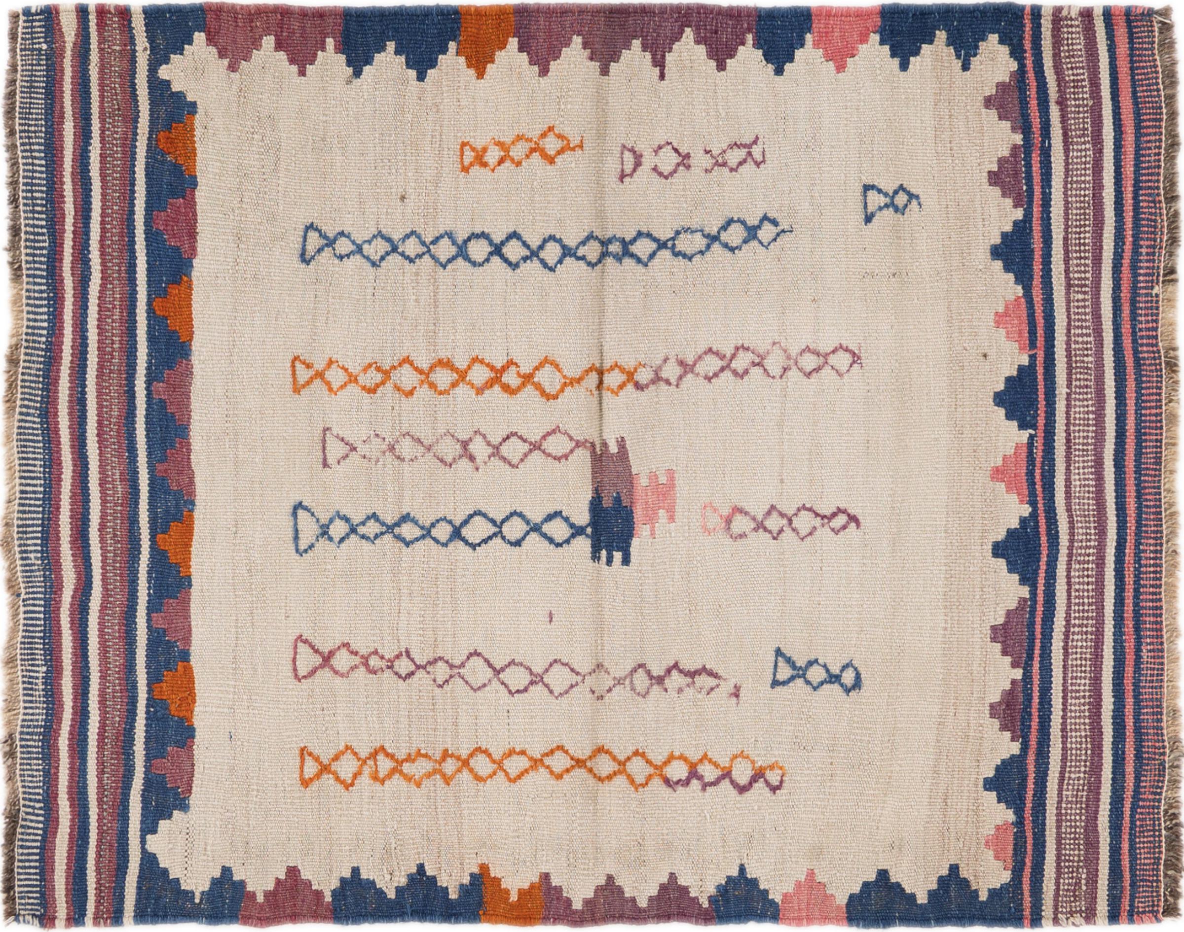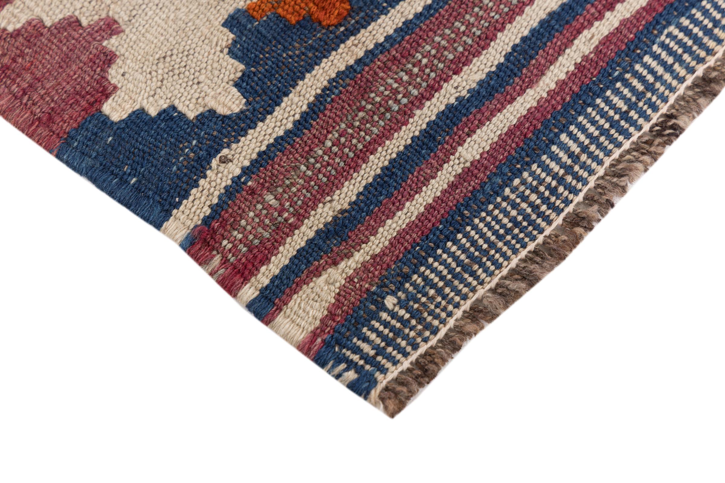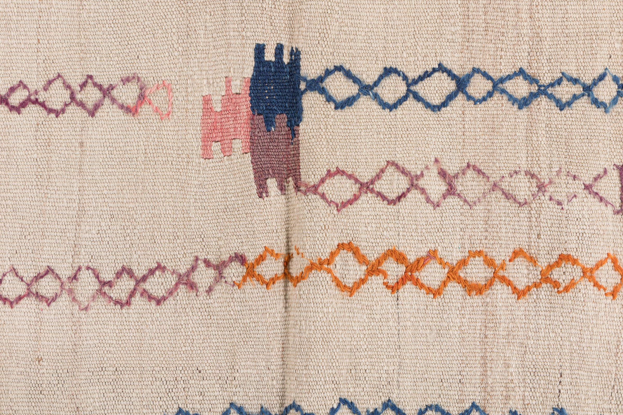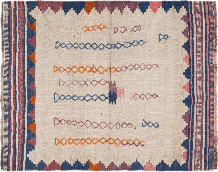 Αυτό το χαλί είναι χειροποίητο ως επίπεδη ύφανση σε αργαλειό. Τα επίπεδα ύφανση είναι χαλιά που δεν έχουν πέλος. Όπως υπόσχεται το όνομα, αυτά τα χαλιά είναι υφαντά και όχι δεμένα με κόμπους. Αυτό έχει ως αποτέλεσμα ένα επίπεδο χαλί με ανάγλυφη επιφάνεια. Τα flatweaves δεν είναι τόσο μαλακά και συνήθως πιο λεπτά από τα χαλιά με κόμπους. Ταυτόχρονα, είναι πολύ λιγότερο πολύπλοκα στην κατασκευή τους και μπορούν συνήθως να τοποθετηθούν και από τις δύο πλευρές (εμπρός και πίσω). Τα σχέδια τους είναι συνήθως γεωμετρικά, κάτι που οφείλεται στην ύφανση.